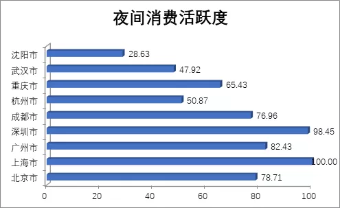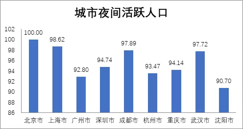從夜間活躍人口來看,北京、上海、成都、武漢夜間人口活躍度最高,以北京為基準(zhǔn)(100),上海是98,成都、武漢都是97,與北京、上海相當(dāng)。